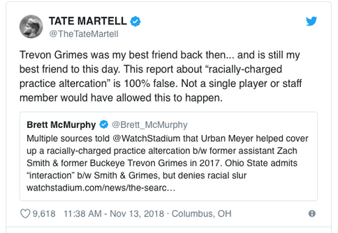Do I think this happened, no. I am basing this off of multiple players tweets from Ohio State players all saying that this did not happen. I can't believe Brett McMurphy over the players who were there. I do think Brett is using awful journalism tactics (no I am not calling myself a journalist). In his original article which I did not post, he puts all of the stories that supports his narrative and the click bait quotes who were given by Trevon Grimes' dad in the beginning of the article. But towards the end throws in quotes from the Florida football spokesman (where Trevon plays currently) that state..."don't believe anything he tells you" talking about Trevon Grimes father and that "Trevon hasn't spoken or seen his dad in over 2 years."